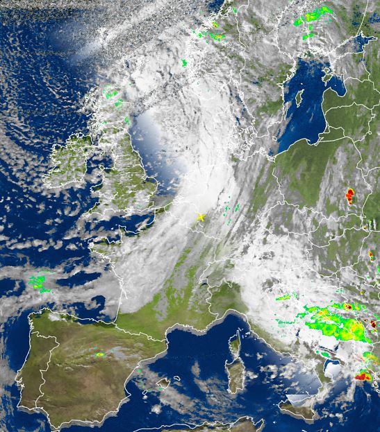 Auf dem Satellitenfoto von heute Nachmittag sind einerseits die sehr kompakten Wolken des Tiefs nördlich der Britischen Inseln zu sehen, die sich entlang eines Frontensystems von Nordfrankreich über Benelux, über die Nordsee bis ins südliche Norwegen erstrecken und dort für sehr unbeständiges und meist nasskaltes Wetter sorgen. Andererseits sorgt ein Tief über der Adria für teils kräftige Schauer und Gewitter rund um die Adria, und hierbei besonders auf dem Balkan.