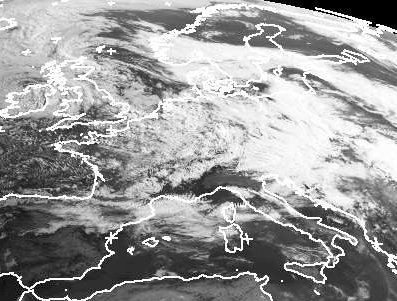 Tief 'Winfried' mit Zentrum über Schottland lenkt von Westen weiter feucht-kühle Luft nach Mitteleuropa. Dabei bildet sich recht dichte Schauerbewölkung. Die Wolkenlücken sind klein. Zum Mittelmeer hin werden die Wolken ebenso wie in Nordskandinavien weniger. (Bildquelle: NERC Satellite Receiving Station, Dundee University, Scotland, http://www.sat.dundee.ac.uk/)