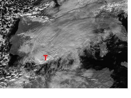 Auf dem Satellitenbild von Donnerstag Mittag ist Portugal nahezu wolkenfrei. Dagegen sorgt ein Tief über der Südküste Spaniens für dichte Wolken mit Regen oder Schnee in weiten Teilen des Landes. Morgen erreicht dieses Tief den Norden von Italien und bringt dann auch den Süden Deutschlands ergiebige Schneefälle.