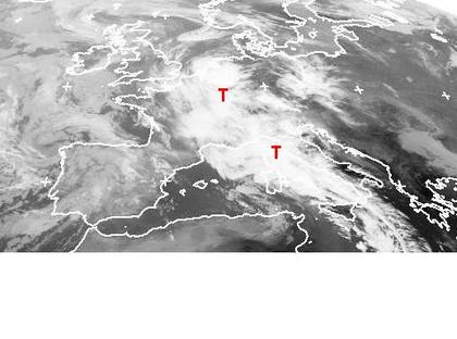 Ein dichtes Wolkenband erstreckt sich auf dem Satellitenbild von Donnerstag früh von der Nordsee über Ostfrankreich bis nach Italien. In ihm enthalten sind zwei kleine Tiefdruckgebiete, die aber gebietsweise für kräftige, teils auch unwetterartige Schauer und Gewitter sorgen. Hiervon ist auch der Westen Deutschlands betroffen. (Bildquelle: NERC Satellite Receiving Station, Dundee University, Scotland, http://www.sat.dundee.ac.uk/)