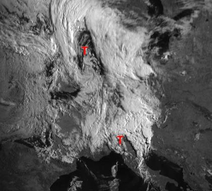 Auf dem Satellitenbild von Samstag früh liegen dichte Wolken von Südskandinavien bis nach Norditalien. Sie gehören zum einen zu Tief 'Volkrat' mit seinem Zentrum über der Nordsee, und bringen teils ergiebigen Regen, teils auch Gewitter. Über Norditalien und den Alpen sorgt ein weiteres Tief für teils kräftige Schauer und Gewitter.