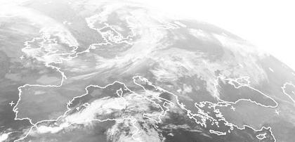 Auf dem Satellittenbild von heute erkennt man eine breite Kaltfront, die sich gegenwärtig in südöstlicher Richtung über Deutschland hinweg bewegt. Neben Deutschland ist es ebenfalls auf den Britischen Inseln, in den Beneluxländern und von der Adria bis zum Balkan wechselhaft und es kommt zu gelegentlichen Regenfällen. Am Mittelmeer dagegen dominiert besonders im östlichen Teil Hochdruckeinfluss. Einzelne Schauer gibt es allerdings an der spanischen Südküste, auf den Balearen Inseln und an der Nordküste der Adria.