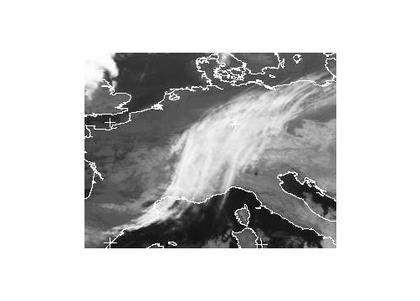 Das Satellitenbild zeigt die restliche Bewölkung 'Doris'', die derzeit zwischen den deutschen Mittelgebirgen und den Alpen liegt. Ihr Niederschlagsfeld schaffte es bis zur Donau und löste sich dann mehr und mehr auf. Das norddeutsche Tiefland ist praktisch wolkenfrei, doch stören hier einige Nebelfelder.