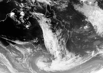 Bei Tasmanien liegt ein Tief, dessen Ausläufer Wolken mit Regen sowohl nach Neuseeland als auch auf den australischen Kontinent bringen. Über dem Landesinneren Australiens kommt es auch zu kräftigen Gewittern.
