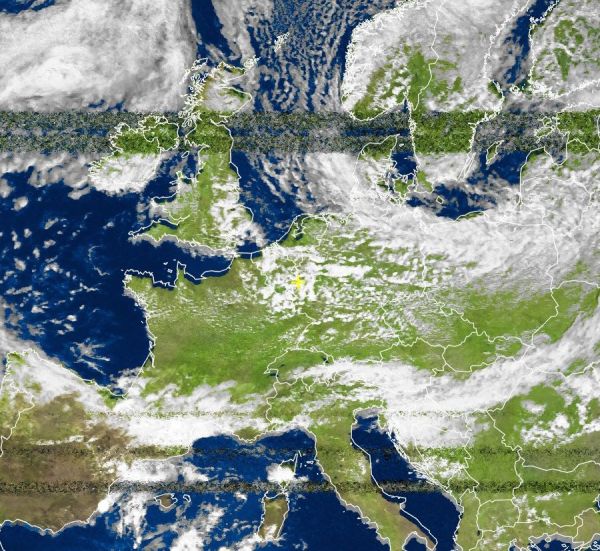 Auf dem Satellitenfoto von heute Nachmittag sind u.a. verbreitet kompakte Wolken über den Pyrenäen, aber auch über den Ostalpen zu erkennen. Hier herrscht zur Zeit sehr durchwachsenes und von zeitweiligen Schauern und auch einzelnen Gewittern durchsetztes Wetter. Auch im westlichen Mittelmeerraum sind einige Quellwolken zu erkennen, dabei bildeten sich teils kräftige Schauer und Gewitter.