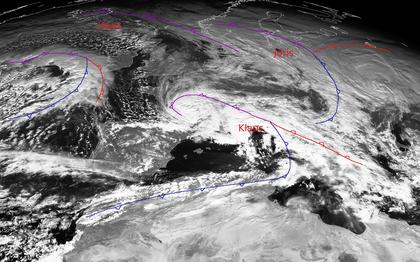 Europa befindet sich heute Mittag unter dem Einfluss mehrerer Tiefdruckgebiete. So liegt über Skandinavien das Sturmtief 'Joris', und über Südfrankreich/Italien ein weiteres Sturmtief namens 'Klaus'. 'Klaus' brachte über Frankreich teils starke Windböen, in Ansätzen lässt sich im Bereich der Okklusion über Frankreich sogar ein Auge erkennen. Des weiteren liegt über Island das alte Tief 'Hans', und auch vor Großbritannien formiert sich ein weiteres Tief. Alle zusammen sorgen für sehr wechselhaftes Wetter in Europa. (Bildquelle: Copyrigt EUMETSAT, NERC Satellite Receiving Station, University of Dundee)