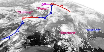 In weiten Teilen Europas überwiegt Tiefdruckeinfluss. Auf dem Satellitenbild vom Freitagmorgen sind zwei Tiefs zu erkennen; der eine von ihnen mit dem Namen 'Franci' liegt über dem Skagerrak, Wolken seines Frontensystem reichen von Südskandinavien bis nach Deutschland; südlich von den Britischen Inseln baut sich das neue Tief 'Gunther' auf. Das alte Tief 'Eberhard' über der Adria löst sich weiter auf, heute bringt es noch teils kräftige Schauer und Gewitter in Süditalien sowie auf dem westlichen Balkan. Das Hoch 'Querida' mit Zentrum über dem Schwarzen Meer hat sich abgeschwächt und ist kaum zu erkennen.