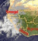 Auf dem Satellitenbildausschnitt von Westafrika sind vom Süden Senegals, über Guinea, Sierra Leone bis nach Liberia vielfach dichte und hochreichende Wolken auszumachen, die dort gebietsweise zu kräftigen Schauern oder Gewittern führen.