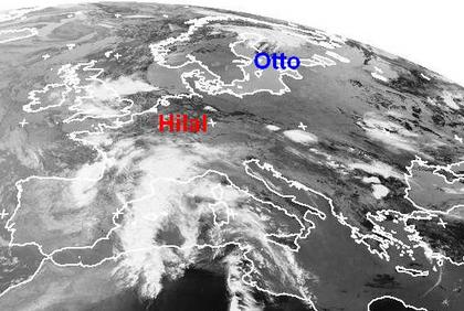 Europa ist zweigeteilt. Von Skandinavien über Polen bis zum Schwarzen Meer sorgt Hoch „Otto“ mit Zentrum über dem Baltikum für wolkenarmen Himmel. Weiter westlich und südwestlich entwickeln sich in feucht-warmer Luft unter dem Einfluss von Tief „Hilal“ mehrere Gewitterwolken. (Bildquelle: NERC Satellite Receiving Station, Dundee University, Scotland, http://www.sat.dundee.ac.uk/)