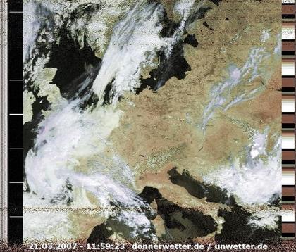Von Nordfrankreich über Benelux bis nach Südschweden erstreckt sich die Bewölkung von Tief Klaus mit seinem Zentrum über den Niederlanden, das heute und morgen für teils starke Gewitter in Mitteleuropa sorgt. Auch über Griechenland ist starke Bewölkung zu erkennen, aus denen sich ebenfalls teils kräftige Gewitter entwickeln.