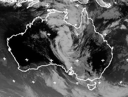 Über dem Zentrum Australiens erkennt man einen Wolkenwirbel. Ein Tief bringt hier verbreitet teils kräftige Gewitter. Sie reichen bis an die Küste Südaustraliens. Teils weht auch ein starker bis stürmischer Wind im Uhrzeigersinn um das Tief herum. (Bildquelle: NERC Satellite Receiving Station, Dundee University, Scotland, http://www.sat.dundee.ac.uk/)