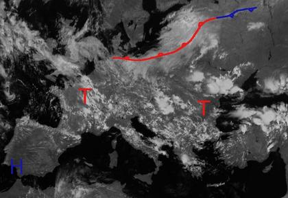 Schauer- und Gewitterwolken zeigt das Satellitenbild von heute Mittag über vielen Teilen Europas. Insbesondere rund ums Schwarze Meer haben sich kräftige Gewitterzellen gebildet, aber auch von den Britischen Inseln bis zum Balkan befinden sich einige Schauer und Gewitter. Möglich wird dies durch feuchtwarme Luft, die vom Schwarzen Meer ausgehend nach Nordwesten strömt. Hochdruckeinfluss herrscht dagegen über weiten Teilen der Iberischen Halbinsel, hier finden sich auch nur wenige Wolken. Die feuchtwarme Luft bleibt in den nächsten Tagen über Mitteleuropa liegen, sodass es zu weiteren Schauern und Gewittern kommt.