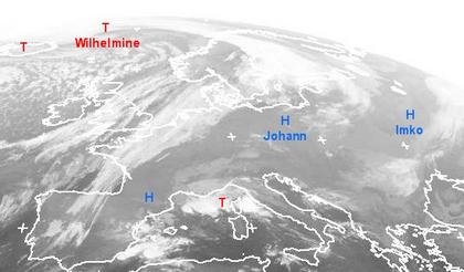 Auf dem Satellitenfoto von heute Morgen 6 Uhr MEZ erkennt man einen großen Bereich von Spanien, über Südostfrankreich, Deutschland und weiter nach Osten und Süden, in dem der Himmel meist nur locker bewölkt oder auch klar ist. Ausnahme bilden einige schwache Tiefausläufer im westlichen und zentralen Mittelmeer. Das Sturmtief 'Wilhelmine' östlich von Island sorgt dagegen mit Ihren zahlreichen Ausläufern in Nord- und Nordwesteuropa für ebenso zahlreiche Schauer oder zeitweise Regen.