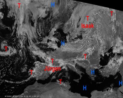 Auf dem Satellitenfoto von heute Nachmittag sorgen zwei ausgeprägte Tiefdruckgebiete einerseits über Südfrankreich und andererseits im Bereich der Ostsee für zahlreichte Schauer oder auch einzelne Gewitter. Ebenfalls zu einzelnen Schauern kommt es in weiten Teilen der Iberischen Halbinsel, über Großbritanien und in weiten Teilen Osteuropas. Deutlich freundlicher und weitgehend trocken ist es besonders im Mittelmeerraum und von Nordfrankreich bis nach Süddeutschland.