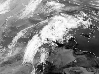 Ein Schwall heißer Saharaluft hat sich auf den Weg nach Norden über das Mittelmeer gemacht. Gut zu erkennen sind die kräftigen Zirruswolken, sie deuten an der Nordseite des Heißluftpakets einen turbulenten Jetstream in höheren Luftschichten an. Urlaubsflieger zu den Balearen und nach Nordafrika wurden heute Morgen kräftig durchgeschüttelt. Obwohl diese Wolken auf dem Satellitenbild recht imposant wirken, bringen sie keinen Regen, denn es handelt sich fast ausschließlich um Federwolken in hohen Luftschichten.