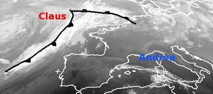 Über Ostdeutschland befinden sich noch Restwolken von Tief 'Yves' über Südskandinavien, die aber allmählich abziehen. Auch die Warmfront von Tief 'Claus' vor Großbritannien streift nur noch den äußersten Norden von Deutschland. Damit ist der Weg frei für Hoch 'Andrea' über Norditalien, das mit einer südwestlichen Strömung subtropische Saharaluft nach Deutschland schaufelt, so dass wohl einige Temperatur-Rekorde purzeln werden. (Bildquelle: http://www.sat.dundee.ac.uk)