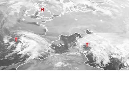 Tiefdruckgebiete sorgen über der Iberischen Halbinsel, sowie von Italien bis Griechenland für dichte Wolken mit Regen oder Schnee, teils sind auch Gewitter möglich. Auch über Skandinavien sind etwas dichtere Wolken möglich, sonst bleibt es unter dem Einfluss von Hoch 'Robinson' über Großbritannien meist freundlich und trocken. (Bildquelle: NERC Satellite Receiving Station, Dundee University, Scotland, http://www.sat.dundee.ac.uk/)