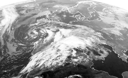 Das Satellitenbild zeigt ein Tief westlich der Biskaya, das in Spanien, Frankreich und Südwest-Deutschland Wolken mit Regen und Regenschauern bringt. Im Nordosten bestimmt ein ein Hoch über Skandinavien das Wetter mit viel Sonnenschein. Über Osteuropa zeigen sich die Wolken eines schwachen Kaltluftvorstoßes auf der Ostseite des Hochs.