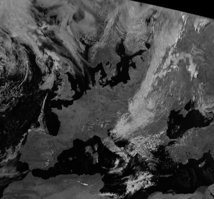 Der westliche Teil von Europa ist unter Einfluss von Hoch 'Urs' zu großen Teilen wolkenfrei. In Deutschland sind markante Strukturen wie der Bodensee und der Harz erkennbar. Im Norden und im Osten von Europa halten sich unter Tiefdruckeinfluss dichtere Wolken.