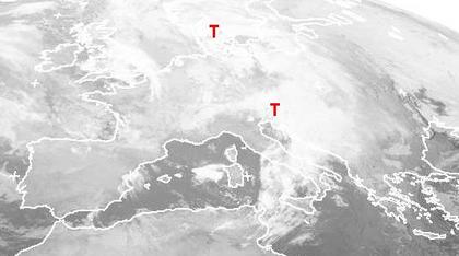 Zwei Tiefdruckgebiete sorgen für dichte Wolken und Regen von der Ostsee über Polen und Ungarn bis zur Adria und Italien, und auch in den westlichen Teilen Europas fällt gebietsweise Regen. Leichter Hochdruckeinfluss über der Iberischen Halbinsel bringt hier meist freundliches Wetter mit nur wenigen Wolken. (Bildquelle: NERC Satellite Receiving Station, Dundee University, Scotland, http://www.sat.dundee.ac.uk/)
