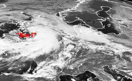 Von der Nordsee über Norddeutschland bis nach Polen liegt am Dienstag Mittag dichte Bewölkung. Es handelt sich dabei um hochnebelartige Wolken, die kaum Regen bringen, sich aber auch zäh unter der Inversion von Hoch 'Paula' halten. Die Sonnenkraft im Oktober reicht oft nicht mehr aus, um sie aufzulösen. Weiter im Westen liegt Tief 'Karl' über den Britischen Inseln, das Deutschland in der Nacht aber nur an der Grenze streift, nach Süden weiter wandert und sich dort auflöst. Damit ist dann der Weg frei für ein neues Hochdruckgebiet in Mitteleuropa. (Bildquelle: NERC Satellite Receiving Station, Dundee University, Scotland, http://www.sat.dundee.ac.uk/)