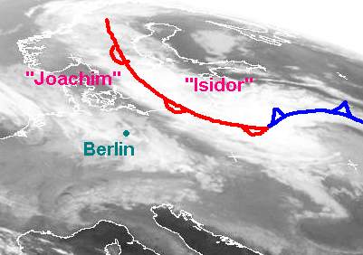 Der Ausschnitt zeigt zwei Tiefdruckgebiete über dem Baltikum und Osteuropa. Der eine von ihnen mit dem Namen 'Joachim' löst sich heute über Dänemark auf, in der letzten Tagen sorgte es für feucht-kühles Wetter in Mitteleuropa. Das Höhentief 'Isidor' bewegt sich langsam von Weißrussland in Richtung Baltikum, vor allem in Norddeutschland, Polen und den Baltikländern bringt es stürmischen Wind und kräftige Niederschläge.