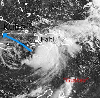 Hurrikan 'Fay', der jüngst noch in Florida ergiebigen Regen brachte, ist kaum fort, da hat sich schon der neue Hurrikan 'Gustav' über dem Atlantik gebildet. Heute Mittag liegen seine Wolken etwa über Haiti und der Dominikanischen Republik. Mit Windgeschwindigkeiten von 140 km/h im Mittel bewegt er sich nun auf Kuba zu und wird sich voraussichtlich noch um einiges verstärken. (Bildquelle: Copyrigt EUMETSAT, NERC Satellite Receiving Station, University of Dundee)