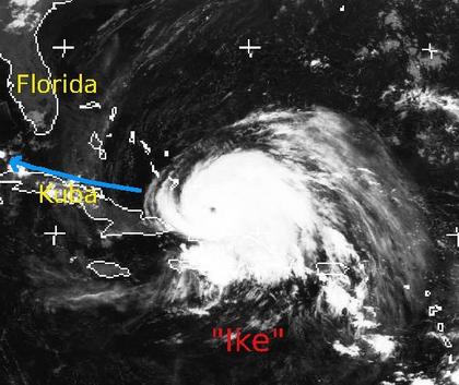 Hurrikan 'Ike' liegt heute mit seinen Wolken über Haiti und der Dominikanischen Republik. Er erreicht Windgeschwindigkeiten von fast 220 km/h im Mittel und ist damit ein Kategorie-4-Hurrikan. Das Auge des Sturms zeigt sich im Satellitenbild von heute Mittag deutlich. Neben dem Wind kommt es auch zur enormen Regenfällen, sodass auf Haiti, das nun innerhalb weniger Wochen den dritten starken Hurrikan erleben muss, schwere Schäden zu befürchten sind. 'Ike' bewegt sich morgen auf Kuba zu und bleibt zunächst sehr gefährlich. (Bildquelle: Copyrigt EUMETSAT, NERC Satellite Receiving Station, University of Dundee)