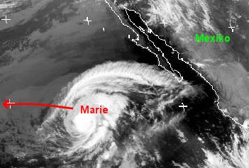 Vor der Westküste Mexikos hat sich gestern aus einem ehemaligem Sturmtief ein Hurrikan der 1. Kategorie gebildet. Hurrikan 'Marie' liegt zur Zeit gut 1000 km westlich des amerikanischen Festlands und wird in den kommenen Tagen weiter aufs offene Meer Richtung Westen ziehen. Im Zentrum des Hurrikans werden Windgeschwindigkeiten um 130 km/h registriert, in Böen sind bis zu 160 km/h möglich. Voraussichtlich am Sonntag wird sich 'Marie' wieder zu einem Sturm abschwächen.