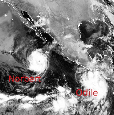 Der Hurrikan 'Norbert' liegt am Donnerstag über dem Pazifik, südöstlich der mexikanischen Küste, vor Niederkalifornien. Er erreicht in Böen Windgeschwindigkeiten bis zu 225 km/h. 'Norbert' wandert nun in nordöstliche Richtung auf Niederkalifornien zu, wo er am Samstag eintreffen wird. Anschließend zieht er aufs mexikanische Festland, wo er sich dann schnell wieder abschwächen wird.