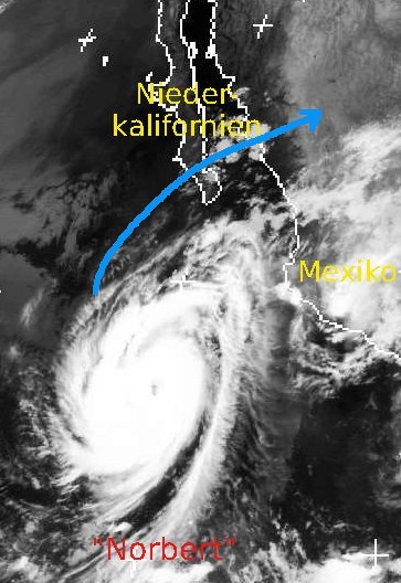 Der Hurrikan 'Norbert' liegt heute Mittag südöstlich der mexikanischen Küste vor Niederkalifornien. Seine derzeitgen Windgeschwindigkeiten betragen 185 km/h im Mittel und 220 km/ in Böen. 'Norbert' wandert nun in nordöstliche Richtung auf Niederkalifornien zu und wird sich voraussichtlich noch etwas verstärken. Anschließend zieht er aufs mexikanische Festland, wo er sich dann schnell wieder abschwächen wird. (Bildquelle: Copyrigt EUMETSAT, NERC Satellite Receiving Station, University of Dundee)