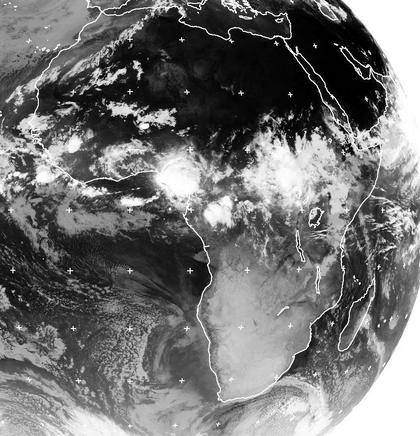 Über Afrika erkennt man vor allem über der Mitte, nördlich des Äquators, die Bewölkung von tropischen Schauern und Gewittern. Fast überall über dem Süden und Norden des Kontinents ist der Himmel wolkenlos. Auch aus den Wolken über der westlichen Sahara fällt kein Regen. (Bildquelle: NERC Satellite Receiving Station, Dundee University, Scotland, http://www.sat.dundee.ac.uk/)