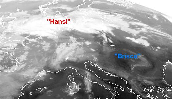Während es in Süd- und Südosteuropa unter dem Einfluss des Hochs 'Brisca' weiter sonnig bleibt, sorgt das Tief 'Hansi' mit Zentrum über der Ostsee für wechselhaftes Wetter in Mitteleuropa. Über der Nordsee und dem Baltikum sind seine Wolken zu erkennen, aus denen es vor allem in Norddeutschland heute zum Teil kräftig geregnet hat.
