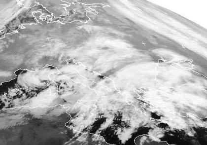Das kräftige Tief 'Karlheinz' bringt verbreitet wechselhaftes Wetter in Südeuropa. Auf dem Sattelitenbild vom Dienstagmorgen erstreckt sich seine Warmfront von bis zum Schwarzen Meer; die nachfolgende Kaltfront reicht bis nach Nordafrika. Zwischen dem Tief 'Karlheinz' und dem Hoch 'Cornelia' westlich der Britischen Inseln strömt von Nordosten her feucht-kalte Luft nach Nord- und Nordwesteuropa, in der sich Schauerwolken entwickeln, man erkennt sie sehr gut über der Nordsee und dem Baltikum.