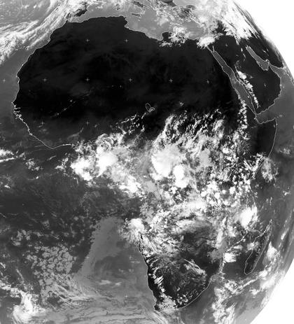 Bis auf die inneren Tropen in unmittelbarer Nähe zum Äquator ist der Norden Afrikas noch meist wolkenfrei. An der Mittelmeerküste Ägyptens erkennt man die ein wenig Schauerbewölkung. Die Bewölkung der tropischen Schauer und Gewitter reicht dagegen deutlich weiter nach Süden. In Südafrika selbst treten aber nur vereinzelt Schauer auf.
