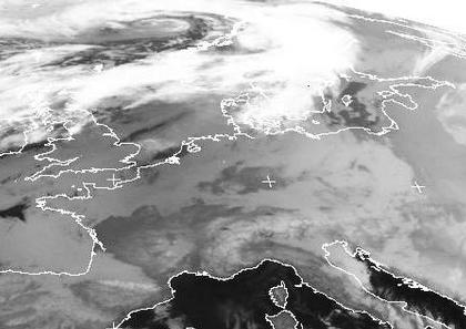 Hoch 'Cornelia' über Frankreich und Süddeutschland gestaltet das Wetter in Deutschland ruhig, aber teilweise trüb. Man erkennt die niedrige, hochnebelartige Wolkendecke sehr gut an der gleichmäßig grauen Farbe. Vor allem auf der Nordseite der Mittelgebirge ist es am Freitagmorgen noch trüb, aber auch zwischen Alb und Alpen hält sich noch trübes Grau. Die dunkleren Flächen dazwischen sind Auflockerungen, teilweise kann es hier jedoch noch neblig sein. In einem hellen Farbton sind die höheren Wolken von Tiefausläufern zu sehen, die den Norden Deutschlands noch streifen.