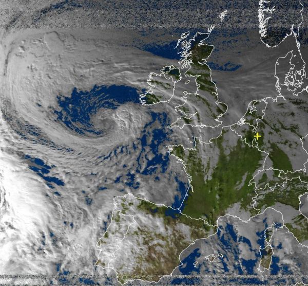 Auf dem Satellitenbild von heute Nachmittag erkennen wir den Wolkenwirbel von Tief "Werner I" westlich von Irland. Seine Ausläufer bringen besonders den Britischen Inseln, jedoch auch Teilen von Frankreich und auf der Iberischen Halbinsel oft dichte Wolken, Regen und insbesondere in den Küstenregionen auch starken bis stürmischen Wind.