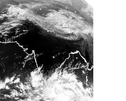 Auf dem Satellitenbild von Montag früh sind Indien und die nördlicheren Regionen nahezu wolkenfrei. Gut zu erkennen ist auch der Verlauf des Himalayagebirges, dass sich mit seinen kühleren Temperaturen (im Infrarotbereich heller dargestellt) deutlich vom wärmeren Indien abhebt. Im äußersten Süden von Indien sorgen teils dichte Wolken für Schauer, teils auch für Gewitter. (Bildquelle: NERC Satellite Receiving Station, Dundee University, Scotland, http://www.sat.dundee.ac.uk/)