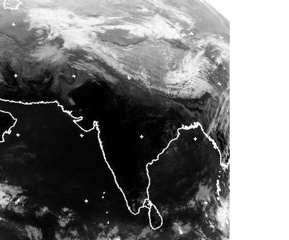 Auf dem Satellitenbild von Donnerstag früh sind Indien und die nördlicheren Regionen nahezu wolkenfrei. Gut zu erkennen ist auch der Verlauf des Himalayagebirges, dass sich mit seinen kühleren Temperaturen (im Infrarotbereich heller dargestellt) deutlich vom wärmeren Indien abhebt.
