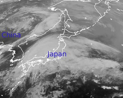 Ein kräftiges Tief bringt heute über weite Teile Japans dichte Wolken und teils heftigen Regen. Nur auf der Nordinsel Hokkaido bleibt es weitgehend trocken. Das Tief zieht bis morgen rasch nach Osten weiter, kann aber zuvor stellenweise über 100 Liter Regen auf den Quadratmeter bringen. Auch über der Mandschurei im Nordosten Chinas erkennt man die Spirale eines weiteren Tiefs, dass auch dort für einigen Regen sorgt.(Bildquelle: Copyrigt EUMETSAT, NERC Satellite Receiving Station, University of Dundee)