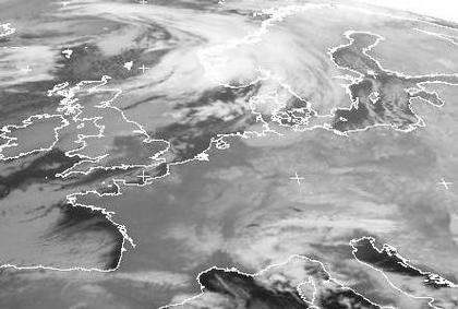 Über Deutschland zeigt das Satellitenbild vom Montagmorgen eine scheckig graue Oberfläche. Was jedoch aussieht wie Wolken, ist die kalte Oberfläche des Schnees. Sie hat eine ähnliche Temperatur wie niedrige Wolkenfelder, sodass sie auf diesem Infrarotbild im gleichen Grauton erscheint. Nur im Norden kann sich bereits ein Ausläufer von Tief 'Claus' breitmachen.