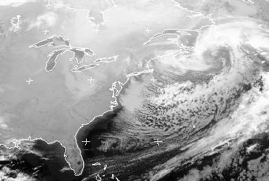 Über dem Osten Nordamerikas ist es unter Hochdruckeinfluss meist wolkenlos. Bei Neufundland liegt aber ein Tief, auf dessen Rückseite arktische Kaltluft an die Ostküste strömt. Über dem Wasser bildet sich in der kalten Luft rasch eine ausgedehnte Schauerbewölkung.