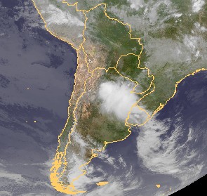 Auf dem heutigen Satellitenbild sind über dem Norden von Argentinien vielfach hochreichende Quellwolken zu erkennen. Diese sorgen bei meist tropischen Temperaturen vielfach für kräftige Schauer und Gewitter.