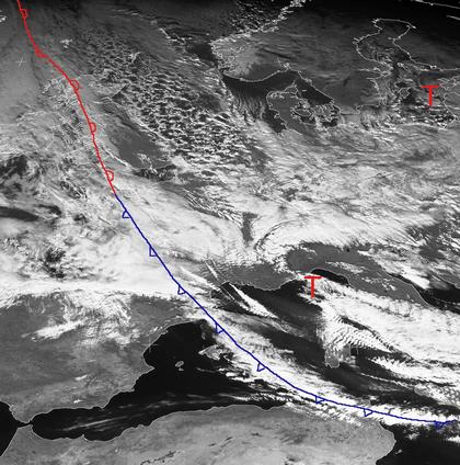Das Satellitenbild von heute Mittag zeigt die Kaltfront von Tief 'Irmela' mit Zentrum über Weißrussland. Die Wolken der Kaltfront erstrecken sich dabei von Westfrankreich bis nach Tunesien und Süditalien. Über den westlichen Britischen Inseln befindet sich die Warmfront des Tiefs 'Jenny' bei Island. Weiterhin zieht über der Nordsee eine Schauerstaffel südwärts. Mit ihr gelangt kalte Luft nach Mitteuropa. Auch morgen bleibt diese Strömung erhalten, die Ausläufer des Tiefs 'Jenny' kommen aber etwas ostwärts voran. (Bildquelle: Copyrigt EUMETSAT, NERC Satellite Receiving Station, University of Dundee)