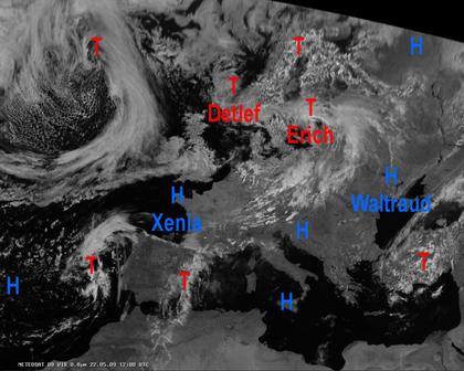 Auf dem heutigen Satellitenbild sind Tiefdruckgebiete von den Britsichen Inseln bis nach Skandinavien und weiter bis in Teile Osteuropas zu erkennen. Hierbei kommt es bei zeitweilig starker Bewölkung besonders über dem Süden Skandinaviens, aber auch von Deutschland bis nach Weissrussland zu teils kräftigen Schauern, örtlich auch zu Gewittern. Ebenso sorgt ein Tiefdruckgebiet über der Türkei für einzelne Schauer oder seltener auch für Gewitter. Sonst ist es aber besonders im Mittelmeerraum, bis auf einzelne Schauer oder Gewitter im westlichen Teil, überwiegend freundlich und trocken.