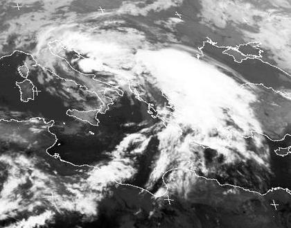 Ein Tief mit Zentrum über der Adria sorgt zurzeit für eine brisante Mischung über dem östlichen Mittelmeer, der Türkei und den Balkanstaaten. Während im Norden über der Ukraine noch eine relativ kühle Luftmasse ruht, wird von Süden über die Türkei heiße Saharaluft angesaugt. Hohe, auf dem Bild helle Wolken und kräftiger Regen sind die Folge, vor allem in der Türkei und Bulgarien, im Laufe des Tages aber auch in den Hochwassergebieten Rumäniens.