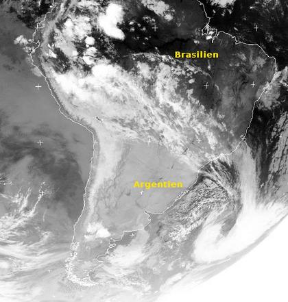 Quer über den Kontinent erstrecken sich die Reste eines alten Tiefs auf dem Südatlantik. Diese Bewölkung trennt warme Luft im Norden von kalter im Süden. Ein Indiz für diese Annahme zeigt sich auf den Landmassen des Kontinents: Während sie in Brasilien dunkel erscheinen, sind sie in Argentien hell. Im infraroten Bereich, in dem der Satellit die Bilder aufgenommen hat, werden höhere Temperaturen dunkler dargestellt. (Bildquelle: NERC Satellite Receiving Station, Dundee University, Scotland, http://www.sat.dundee.ac.uk/)