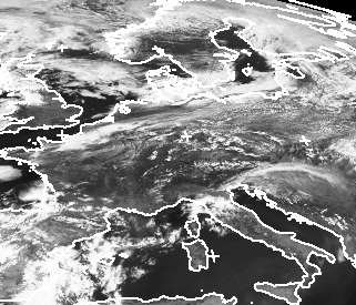 Auf dem Satellitenbild vom Samstag Mittag ist es unter dem Einfluss von Hoch 'Iris' über Mitteleuropa meist nur leicht bewölkt. Über den Mittelgebirgen haben sich bereits einige Quellwolken gebildet. Dichtere Wolken findet man über Nord- und Ostsee. Die hochnebelartige Bewölkung hat sich dort in feuchter Luft gebildet und zieht ins Landesinnere, wo sie sich langsam auflöst. (Bildquelle: NERC Satellite Receiving Station, Dundee University, Scotland, http://www.sat.dundee.ac.uk/)