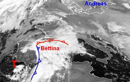 Das Hoch „Andreas“ mit Zentrum über Skandinavien und Nordwestrussland bleibt weiterhin wetterbestimmend in weiten Teilen Mittel-, Ost- und Nordeuropas mit kalter Luft, neben Nebel und Hochnebel kann es hier und da auch auflockern, auf dem Satellitenbild vom Samstagmorgen sind teilweise die Alpen zu erkennen. Über der Iberischen Halbinsel liegt das Tief „Bettina“, Wolken seines Frontensystems reichen von Frankreich bis nach Marokko und Nordalgerien, im hohen Atlasgebirge kann es sogar schneien. Weiter westlich über dem Atlantik wirbelt sich ein neues Tiefdruckgebiet auf, man kann es an einer Wolkenspirale erkennen.