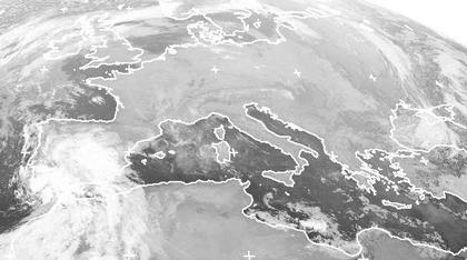 Unter Hochdruckeinfluss sind weite Teile Europas fast wolkenfrei, dennoch ist es gebietsweise neblig oder trüb. Dagegen bringt ein Tief teils kräftige Schauer und Gewitter in Spanien und Portugal. (Bildquelle: NERC Satellite Receiving Station, Dundee University, Scotland, http://www.sat.dundee.ac.uk/)